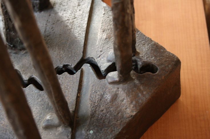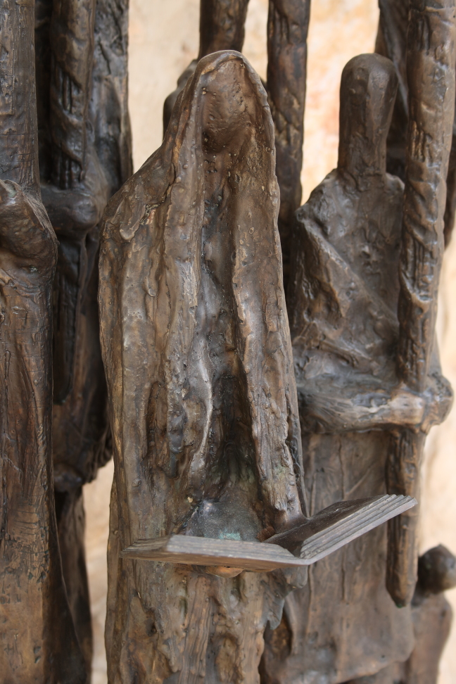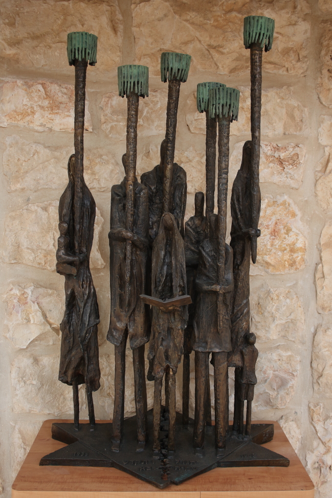The menorah, work of the Israeli artist Aharon Bezalel, has six candle holders, held by men, women and children, symbolising the six million Jews who perished in the Shoah. At the centre, is a seventh figure, in prayer. All the figures are standing on a star of David, that is almost, but not completely, broken.